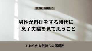 家族との関わり 男性が料理をする時代に ― 息子夫婦を見て思うこと かつては「男は厨房に入らず」が当たり前だった時代。そんな中で息子夫婦の自然な家事分担や、夫の少しずつの変化を見て感じたことを綴ります。家族の姿から見える時代の移り変わりと、夫婦のこれから。 2025.10.03 家族との関わり