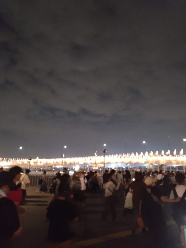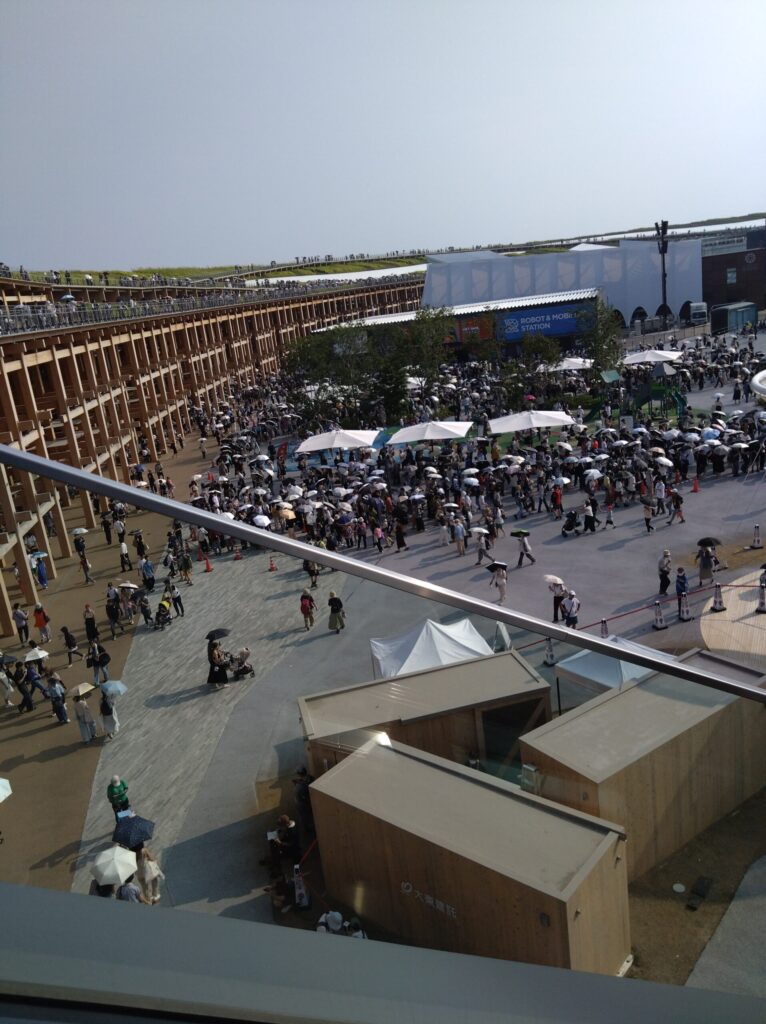行きの地下鉄メトロの車内では、夢洲に近づいたところで「次はいよいよ夢洲です」というアナウンスが流れました。その瞬間、乗客のみんなが「こんなん言うんやなあ」と顔を見合わせて笑いが起き、車内が和やかな空気に包まれたのも印象的でした。前回は西ゲートからの入場だったので、思いがけない体験に少し得した気分になりました。
