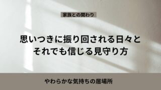 家族との関わり 思いつきに振り回される日々と、それでも信じる見守り方 娘の結婚式に参加できなかった長男。睡眠障害や特性により思いつきで行動する彼との日々を振り返りながら、母として「見守るしかない」と感じた思いを綴ります。結婚式に参加できなかった長男。 2025.09.01 家族との関わり