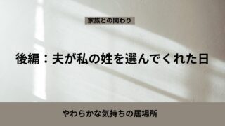 家族との関わり 後編:夫が私の姓を選んでくれた日 出会いから結婚までの道のりを振り返り、夫が私の姓を選んでくれたことへの感謝を綴りました。運命のご縁と、今だからこそ言葉にできる思いを記録しています。 2025.09.11 家族との関わり