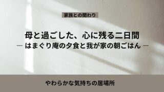 家族との関わり 母と過ごした、心に残る二日間 ― はまぐり庵の夕食と我が家の朝ごはん ― 万博の帰りに母を連れて行った「はまぐり庵」での夕食と、翌朝のコーヒータイム。夫の優しさと母の笑顔に包まれた、心温まる二日間を記録しました。 2025.10.18 家族との関わり